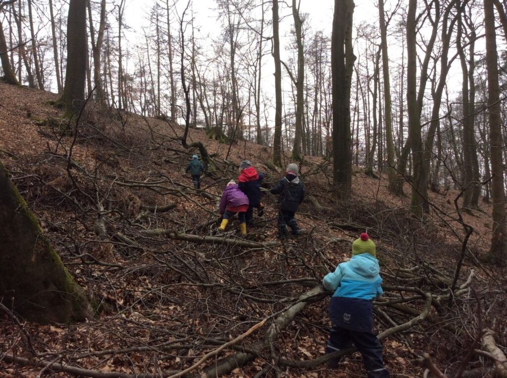 Naturbelassener Waldboden fördert die Wahrnehmung und körperliche Geschicklichkeit, Grob- und Feinmotorik. Denn beim Laufen über Stock und Stein, beim Stapfen durch die Matsche oder Balancieren auf einem Baumstamm bilden sich Gleichgewichtssinn und feinste Wahrnehmungen des eigenen Körpers und der Beschaffenheit der Umwelt heraus.